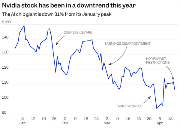 “今年,英偉達投資者都無法獲得喘息。”美國“商業(yè)內(nèi)幕”網(wǎng)站17日分析稱,今年接二連三的事件都在打擊英偉達的股價,從DeepSeek需要更少人工智能芯片的系統(tǒng)、特朗普的關(guān)稅政策到最新的出口限制措施,該股今年迄今已下跌逾20%,相較于1月高點下跌約30%,跌幅遠超科技公司占大頭的納斯達克100指數(shù)。市場對英偉達股票的擔憂加劇。