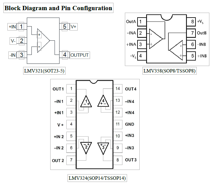 LMV324和LMV358為低壓(2.7 V ~ 5)。0 V)版本的雙運放和四運放LM324和LM358;工作電壓在5v到30v之間LMV321是單放大器版本。
