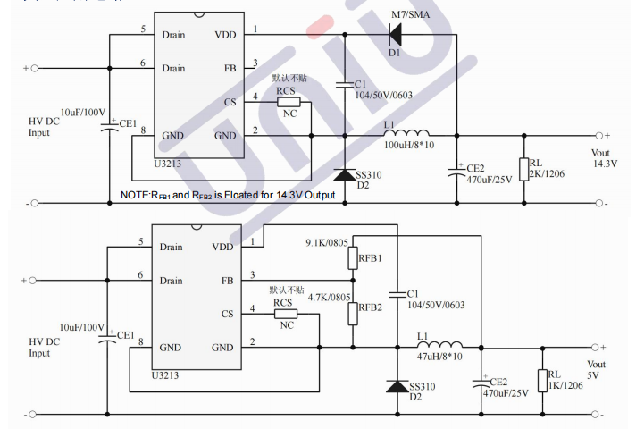 •主要特點(diǎn):集成 3A 160V MOS ;集成 180V 高壓啟動(dòng)電路;集成限流電阻(默認(rèn)1.2A);多模式控制、無異音工作;支持降壓和升降壓拓?fù)洌荒J(rèn)14.3V輸出(FB 腳懸空);待機(jī)功耗低于 50mW;良好的線性調(diào)整率和負(fù)載調(diào)整率;集成軟啟動(dòng)電路;內(nèi)部保護(hù)功能: 過載保護(hù)(OLP);逐周期電流限制(OCP);輸出過壓保護(hù)(OVP);VDD 過壓、欠壓和電壓箝位保護(hù)